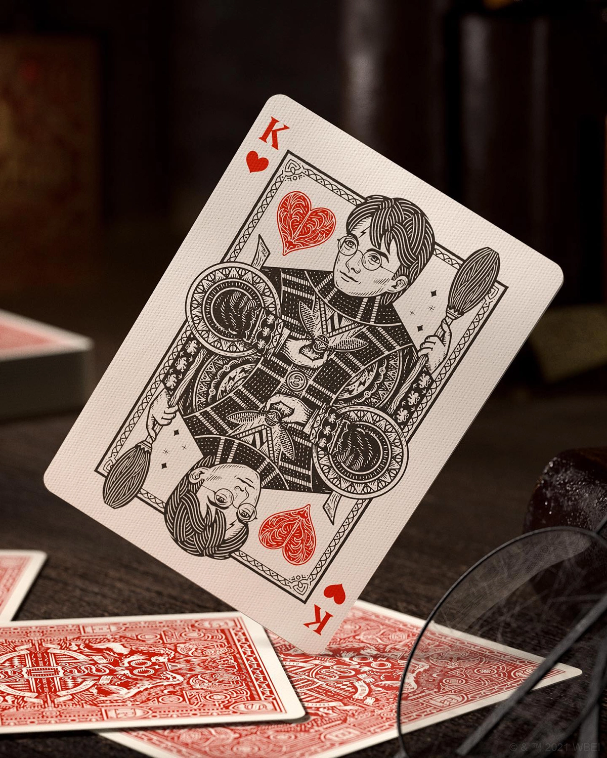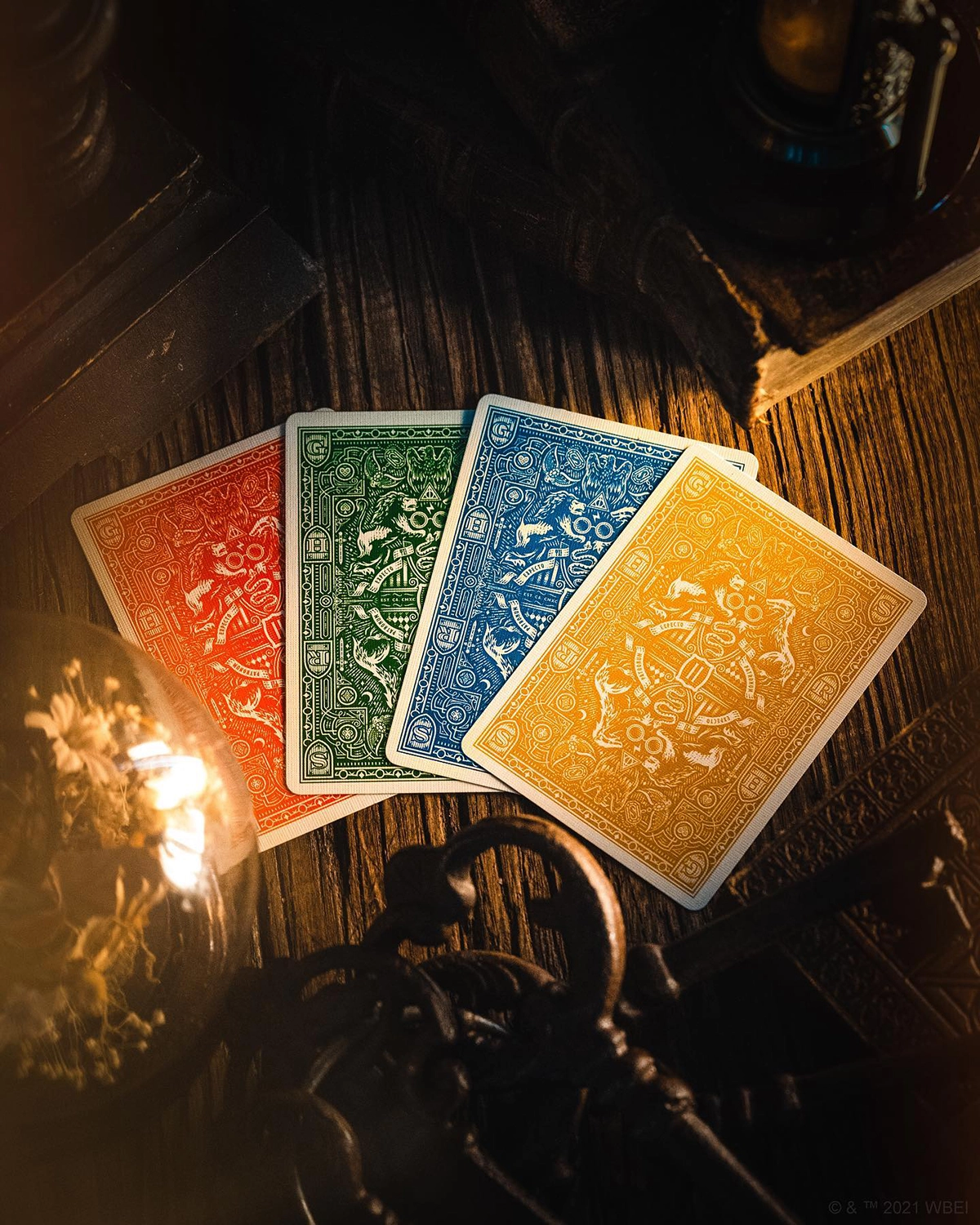 4 decks (paquet de cartes) aux couleurs des 4 maisons de Poudlard dans un style médiéval, orné d’illustrations et typographies incrustées.
